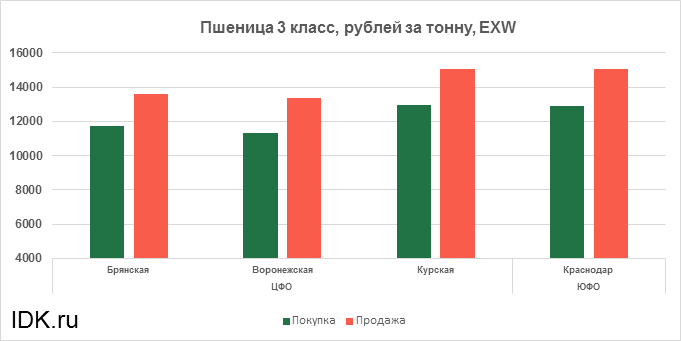 За прошедшую неделю с 18.09.2023 по 22.09.2023 средняя цена на пшеницу 3-го класса, согласно выставленным заявкам трейдеров, выросла по всем округам на 677 рублей. Средняя цена составляет 13668 рублей за тонну.