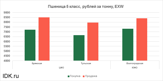 За прошедшую неделю с 18.09.2023 по 22.09.2023 средняя цена на пшеницу 5-го класса, согласно выставленным заявкам трейдеров, упала по всем округам на 558 рублей. Средняя цена составляет 7317 рублей за тонну.