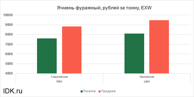 За прошедшую неделю с 18.09.2023 по 22.09.2023 средняя цена на фуражный ячмень, согласно выставленным заявкам трейдеров, упала по всем округам на 1712 рублей. Средняя цена составляет 7031 рубль за тонну.