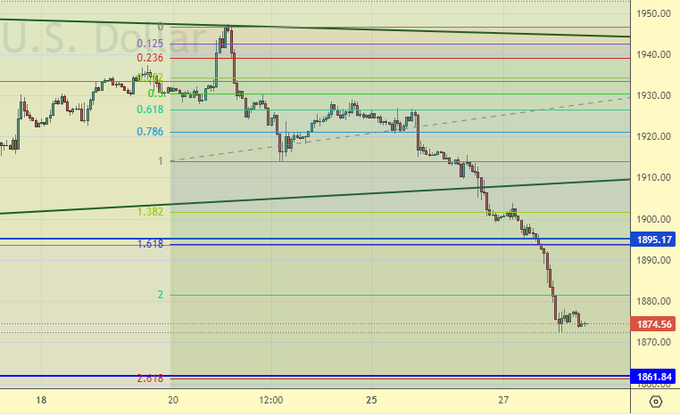 Продолжаем падать. Первая цель на 1862 уже в зоне досягаемости. Скорее всего мы к ней сегодня приблизимся. Имеет смысл зафиксировать часть прибыли при подходе к данной отметке. После 1862 нас скорее всего ждет откат к 1895.