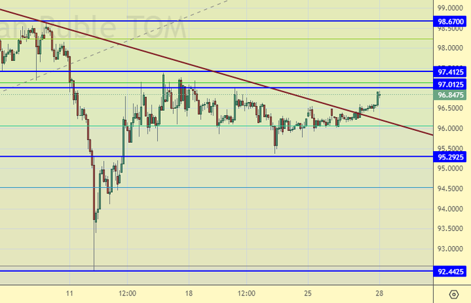 Нет ни одной часовой красной свечи. Это плохо для рубля. Мы рискуем подняться выше 98.00, что может очень быстро привести к продолжению ослабления национальной валюты. Банкиры не торопятся покупать облигации Правительства РФ по ставке 2.5% + инфляция, что наводит на единственную мысль: печать денег будет идти ускоренными темпами без привязки к ЗВР, так как в долг никто не дает.