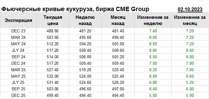 На 02.10.2023 стоимость кукурузы на бирже CME Group по контракту DEC 23 составила 488.6 цента за бушель. За прошедшую неделю стоимость кукурузы на площадке CME Group выросла на 7.4 цента/бушель. Как мы видим на графике, фьючерсная кривая имеет периоды, когда более дальний фьючерс дешевле ближнего. Состояние бэквардации наблюдаем на следующих контрактах: SEP 24; JLY 25; SEP 25; DEC 25. Таким образом, трейдеры предполагают, что возможно превалирование предложения над спросом в указанные периоды.