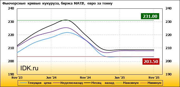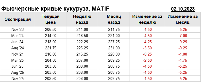 На 02.10.2023 стоимость кукурузы на бирже MATIF по контракту Nov ’23 составила 206.5 евро за тонну. За прошедшую неделю стоимость кукурузы на европейской площадке упала на 4.5 евро/тонна. Как мы видим на графике, фьючерсная кривая имеет периоды, когда более дальний фьючерс дешевле ближнего. Состояние бэквардации наблюдаем на следующих контрактах: Nov ’24; Mar ’25; Jun ’25. Таким образом, трейдеры предполагают, что возможно превалирование предложения над спросом в указанные периоды.
