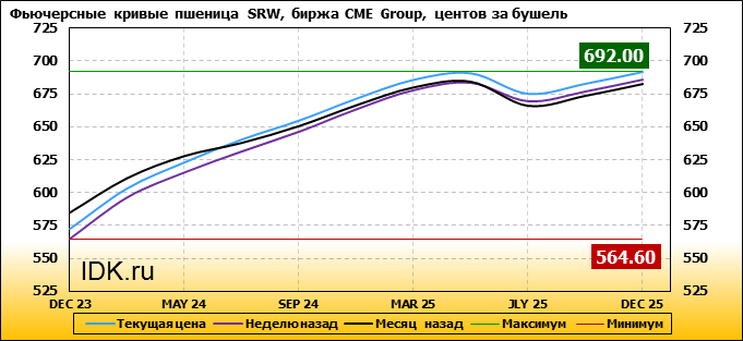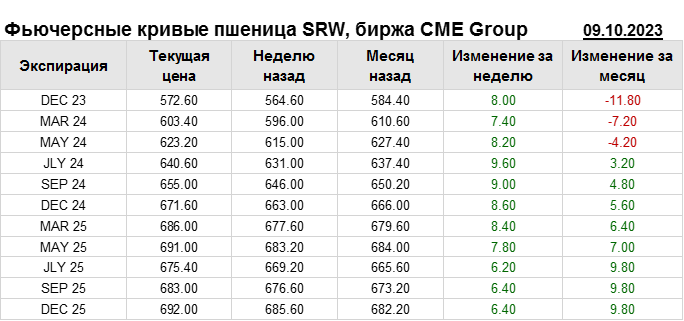 На 09.10.2023 стоимость пшеницы SRW на бирже CME Group по контракту DEC 23 составила 572.6 цента за бушель. За прошедшую неделю стоимость пшеницы SRW выросла на 8 центов/бушель. Как мы видим на графике, фьючерсная кривая имеет периоды, когда более дальний фьючерс дешевле ближнего. Состояние бэквардации наблюдаем на следующих контрактах: JLY 25. Таким образом, трейдеры предполагают, что возможно превалирование предложения над спросом в указанные периоды.
