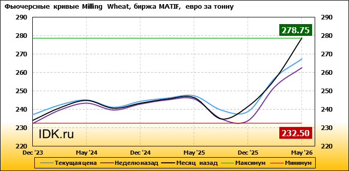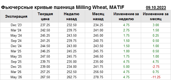 На 09.10.2023 стоимость пшеницы Milling Wheat на бирже MATIF по контракту Dec ’23 составила 237.25 евро за тонну. За прошедшую неделю стоимость пшеницы Milling Wheat выросла на 4.75 евро/тонна. Как мы видим на графике, фьючерсная кривая имеет периоды, когда более дальний фьючерс дешевле ближнего. Состояние бэквардации наблюдаем на следующих контрактах: Sep ’24; Sep ’25; Dec ’25. Таким образом, трейдеры предполагают, что возможно превалирование предложения над спросом в указанные периоды.