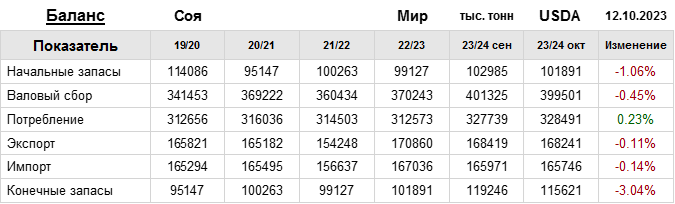 За прошедший месяц министерство сельского хозяйства США (USDA) на 12.10.2023 пересмотрело Баланс сои для Мира в сезоне 23/24 следующим образом: