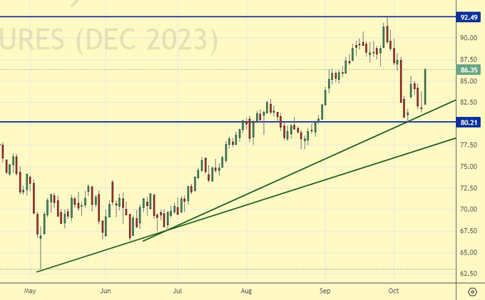 Падение цен на пшеницу, которое происходило в сентябре за счет изобилия зерна в России и Аргентине, судя по всему, закончилось. На фоне конфликта на Ближнем Востоке спрос на зерно со стороны импортеров только вырастет. Египет, Турция, Саудовская Аравия, Ливан, Пакистан, возможно Индия – все будут наращивать покупки так-как на горизонте уже появились миллионы беженцев и их надо чем-то кормить.