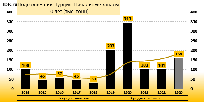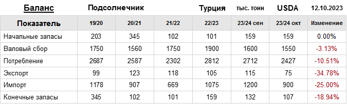За прошедший месяц министерство сельского хозяйства США (USDA) на 12.10.2023 пересмотрело Баланс подсолнечника для Турции в сезоне 23/24 следующим образом: