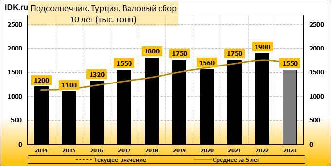 Валовый сбор: оценка пересмотрена в сторону понижения до 1550 тысяч тонн. Показатель упал на -3.13 процента.