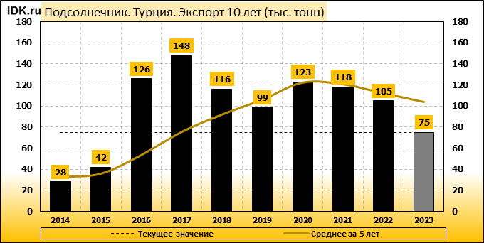 Экспорт: оценивается в 75 тысяч тонн. За месяц показатель упал на -34.78 процента.