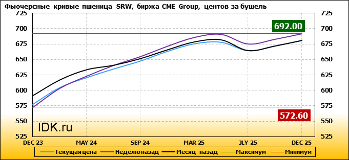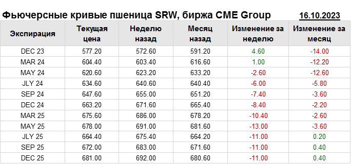 На 16.10.2023 стоимость пшеницы SRW на бирже CME Group по контракту DEC 23 составила 577.2 цента за бушель. За прошедшую неделю стоимость пшеницы SRW выросла на 4.6 цента/бушель. Как мы видим на графике, фьючерсная кривая имеет периоды, когда более дальний фьючерс дешевле ближнего. Состояние бэквардации наблюдаем на следующих контрактах: JLY 25. Таким образом, трейдеры предполагают, что возможно превалирование предложения над спросом в указанные периоды.