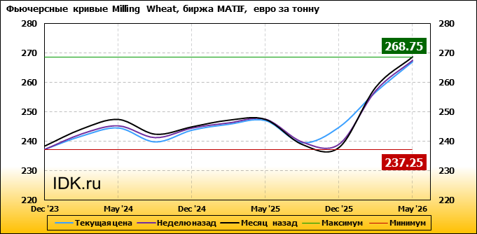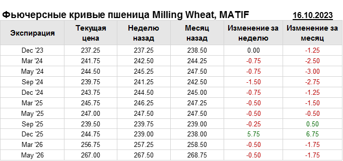 На 16.10.2023 стоимость пшеницы Milling Wheat на бирже MATIF по контракту Dec ’23 составила 237.25 евро за тонну. За прошедшую неделю стоимость пшеницы Milling Wheat не изменилась. Как мы видим на графике, фьючерсная кривая имеет периоды, когда более дальний фьючерс дешевле ближнего. Состояние бэквардации наблюдаем на следующих контрактах: Sep ’24; Sep ’25. Таким образом, трейдеры предполагают, что возможно превалирование предложения над спросом в указанные периоды.