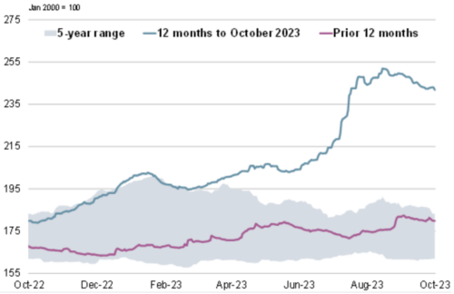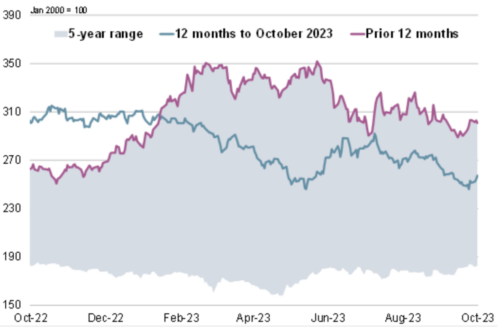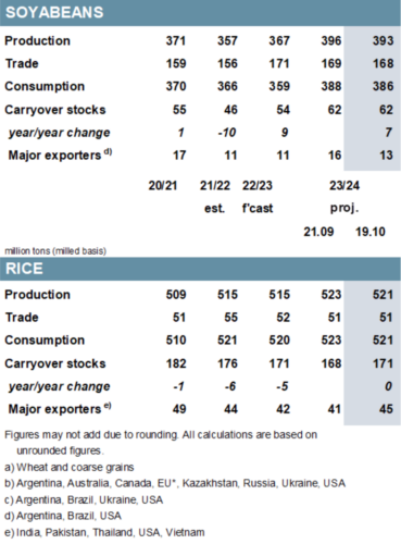 Учитывая понижение показателей Индии, прогноз потребления риса в 2022/23 году снижен на 2 млн тонн по сравнению с предыдущим периодом. Вместе с несколько увеличенной оценкой добычи мировые конечные запасы увеличится примерно на 3 млн тонн в месяц. С учетом меньшего показателя для Таиланда, мировое производство риса в 2023/24 году прогнозируется на 2 млн тонн меньше, чем в сентябре, что связано со снижением ожиданий относительно его потребления. Объем торговли в 2024 году (январь/декабрь) прогнозируется стабильным по сравнению с предыдущим месяцем, на уровне почти 51 млн тонн, что является вторым ежегодным падением подряд.