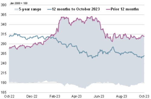 Индекс риса IGC GOI снизился на 3% м/м на фоне в целом сдержанной активности, поскольку экспортные цены в Азии консолидировались после более раннего уверенного роста.