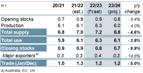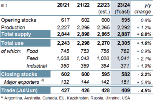 Поскольку пониженные оценки по кукурузе и ячменю лишь частично компенсируются большим количеством пшеницы, прогноз мирового производства зерна (пшеница и фуражное зерно) в 2023/24 году снизится на 2 млн тонн в месяц (в месячном исчислении) до 2292 тонн. м. На фоне незначительных компенсирующих изменений по ключевым компонентам спроса прогноз потребления сохраняется на уровне 2 305 млн тонн.