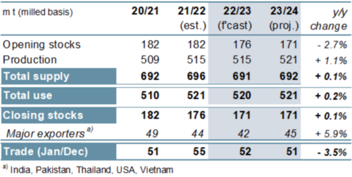 Из-за снижения спроса со стороны покупателей в Азии, включая Китай, торговля рисом, как ожидается, снизится на 5% по сравнению с аналогичным периодом прошлого года в 2023 году (январь/декабрь). Мировое производство, связанное с потенциально более крупными основными культурами в Азии и Америке, может достичь пика в 2023/24 году, при этом ожидается, что потребление будет расти, поскольку запасы останутся стабильными. Прогнозируется, что в 2024 году мировая торговля продолжит сокращаться, главным образом из-за более мягких закупок со стороны азиатских импортеров. Что касается экспортеров, то ожидается, что поставки из Индии заметно сократятся до четырехлетнего минимума.