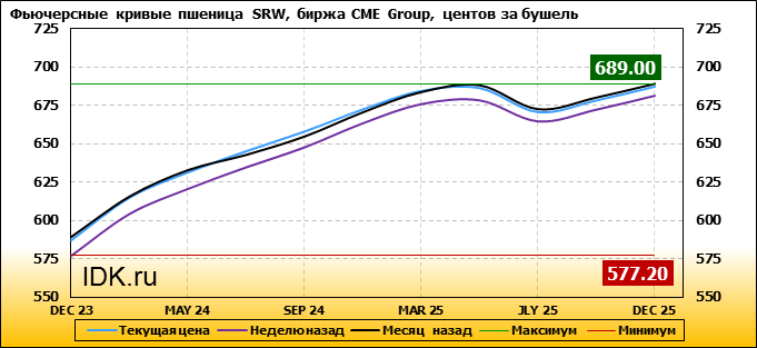 На 23.10.2023 стоимость пшеницы SRW на бирже CME Group по контракту DEC 23 составила 587.2 цента за бушель. За прошедшую неделю стоимость пшеницы SRW выросла на 10 центов/бушель. Как мы видим на графике, фьючерсная кривая имеет периоды, когда более дальний фьючерс дешевле ближнего. Состояние бэквардации наблюдаем на следующих контрактах: JLY 25. Таким образом, трейдеры предполагают, что возможно превалирование предложения над спросом в указанные периоды.