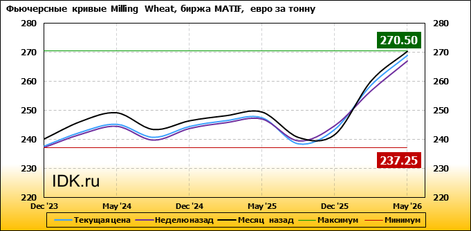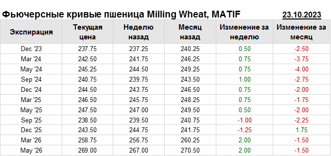На 23.10.2023 стоимость пшеницы Milling Wheat на бирже MATIF по контракту Dec ’23 составила 237.75 евро за тонну. За прошедшую неделю стоимость пшеницы Milling Wheat выросла на 0.5 евро/тонна. Как мы видим на графике, фьючерсная кривая имеет периоды, когда более дальний фьючерс дешевле ближнего. Состояние бэквардации наблюдаем на следующих контрактах: Sep ’24; Sep ’25. Таким образом, трейдеры предполагают, что возможно превалирование предложения над спросом в указанные периоды.