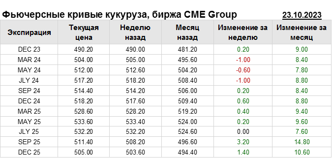 На 23.10.2023 стоимость кукурузы на бирже CME Group по контракту DEC 23 составила 490.2 цента за бушель. За прошедшую неделю стоимость кукурузы на площадке CME Group выросла на 0.2 цента/бушель. Как мы видим на графике, фьючерсная кривая имеет периоды, когда более дальний фьючерс дешевле ближнего. Состояние бэквардации наблюдаем на следующих контрактах: SEP 24; JLY 25; SEP 25; DEC 25. Таким образом, трейдеры предполагают, что возможно превалирование предложения над спросом в указанные периоды.
