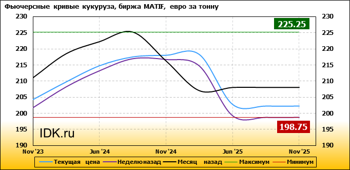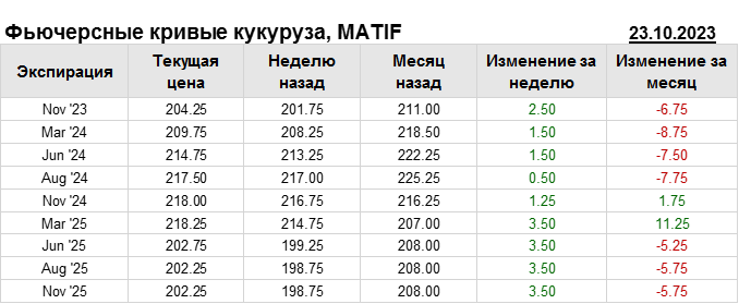 На 23.10.2023 стоимость кукурузы на бирже MATIF по контракту Nov ’23 составила 204.25 евро за тонну. За прошедшую неделю стоимость кукурузы на европейской площадке выросла на 2.5 евро/тонна. Как мы видим на графике, фьючерсная кривая имеет периоды, когда более дальний фьючерс дешевле ближнего. Состояние бэквардации наблюдаем на следующих контрактах: Jun ’25. Таким образом, трейдеры предполагают, что возможно превалирование предложения над спросом в указанные периоды.