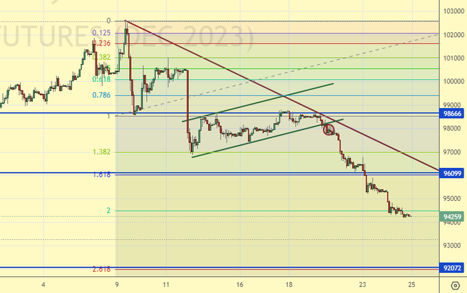 Продажа: нет. Кто в позиции от 98000, перенесите стоп на 94600. Цель: 92100.