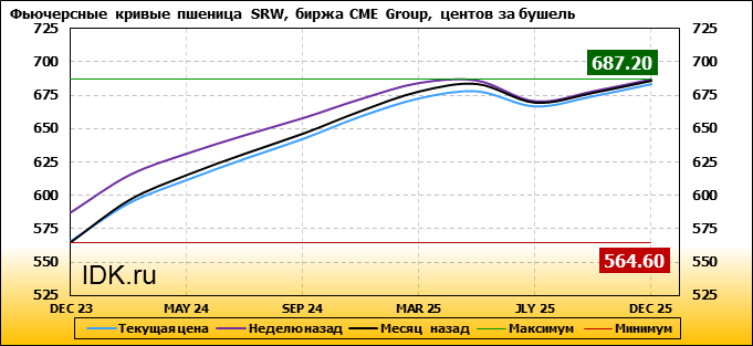 На 30.10.2023 стоимость пшеницы SRW на бирже CME Group по контракту DEC 23 составила 566 центов за бушель. За прошедшую неделю стоимость пшеницы SRW упала на 21.2 цента/бушель. Как мы видим на графике, фьючерсная кривая имеет периоды, когда более дальний фьючерс дешевле ближнего. Состояние бэквардации наблюдаем на следующих контрактах: JLY 25. Таким образом, трейдеры предполагают, что возможно превалирование предложения над спросом в указанные периоды.