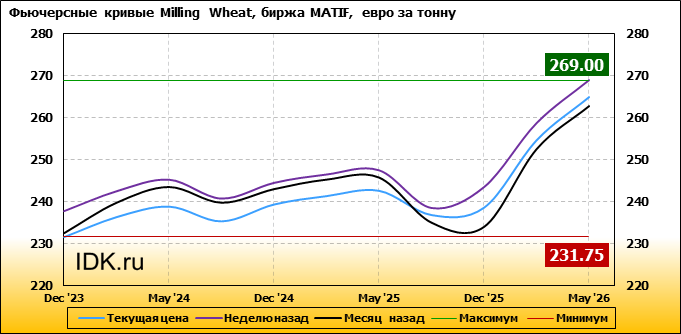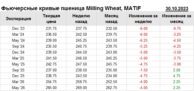 На 30.10.2023 стоимость пшеницы Milling Wheat на бирже MATIF по контракту Dec ’23 составила 231.75 евро за тонну. За прошедшую неделю стоимость пшеницы Milling Wheat упала на 6 евро/тонна. Как мы видим на графике, фьючерсная кривая имеет периоды, когда более дальний фьючерс дешевле ближнего. Состояние бэквардации наблюдаем на следующих контрактах: Sep ’24; Sep ’25. Таким образом, трейдеры предполагают, что возможно превалирование предложения над спросом в указанные периоды.