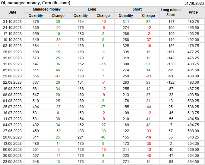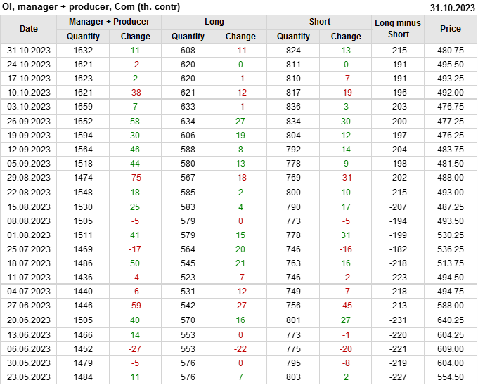 За прошлую неделю, 25.10.23 — 31.10.23, разница между длинными и короткими позициями управляющих увеличилась на 47.6 тыс. контрактов. В тоже время, цена упала на 14.75 цента.
