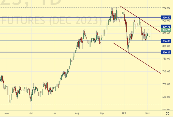 Growth scenario: we are considering November futures, expiration date is December 12. If there is a rise above 950.0, you will have to buy. Let’s also take from 700.0. We do nothing at current prices.