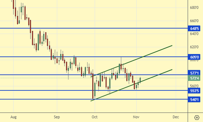 Growth scenario: we are considering December futures, expiration date is December 14. If it rises above 580.0, we will buy. The market may become nervous about the carnage in the Middle East.