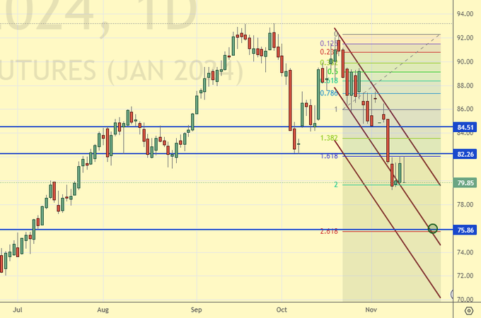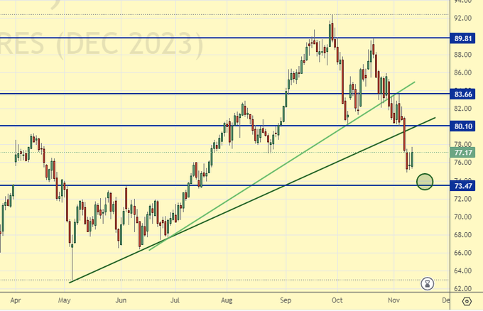Growth scenario: we are considering December futures, expiration date November 20. We got a strong drop and bought from 76.00. Those interested can add from 73.50.