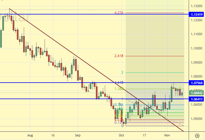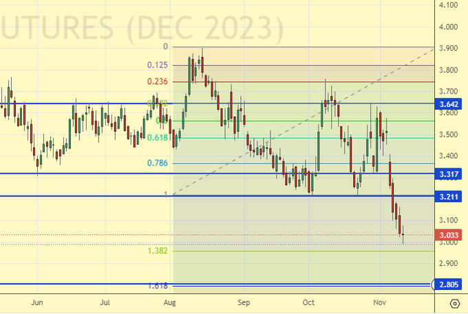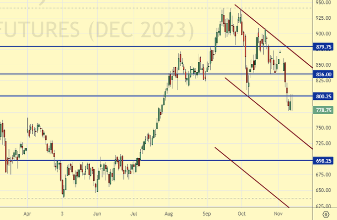 Judging by USDA reporting, everything is generally good. Note that the gross corn harvest increased by 0.5%, which led to a drawdown that risks turning into a fall to the level of 400.0, which would be 15% of the current level. Wheat is unlikely to fall also radically, since forecasts for it remained at the October level, and even decreased slightly.