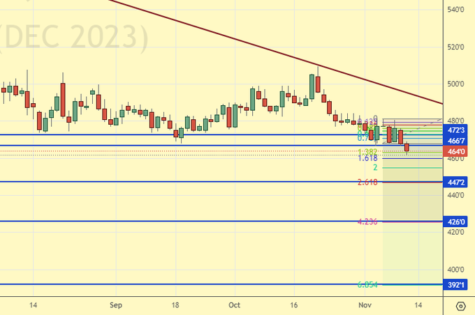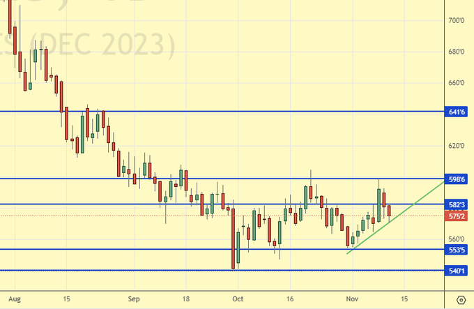 Growth scenario: we are considering November futures, expiration date January 12. Soybeans retain the potential to continue their upward movement. But given the improvement in forecasts for it, we are not buying.
