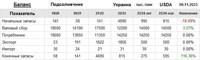 За прошедший месяц министерство сельского хозяйства США (USDA) на 09.11.2023 пересмотрело Баланс подсолнечника для Украины в сезоне 23/24 следующим образом: