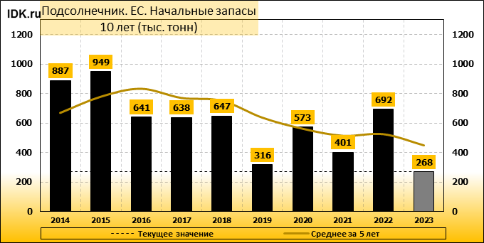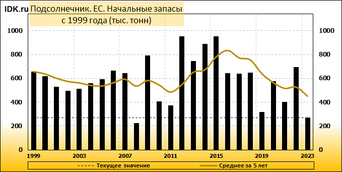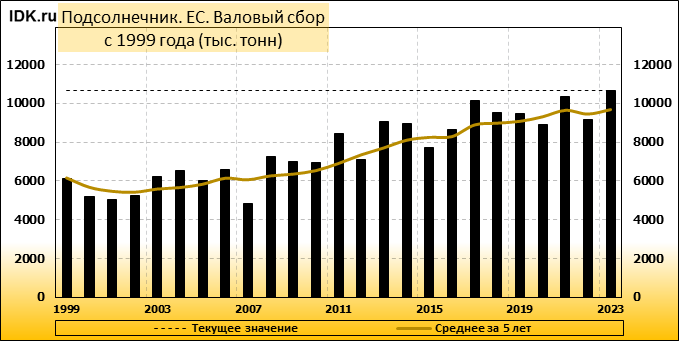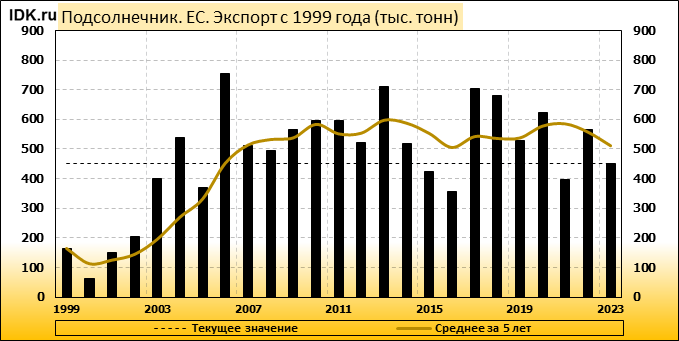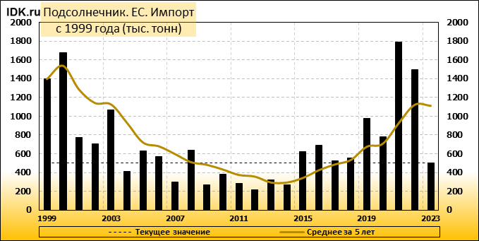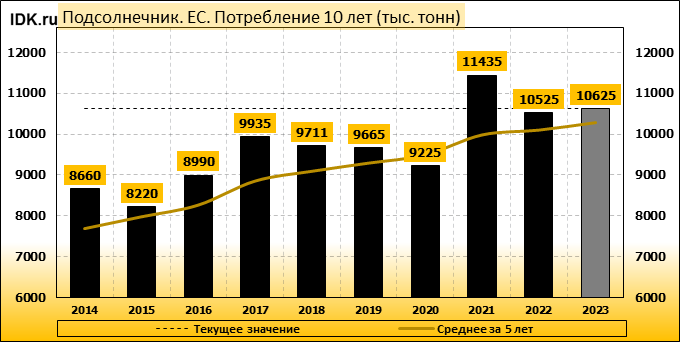 Посевная площадь всех масличных культур в ЕС увеличится в 2023-2024 году всего на 2% и составит 12,67 млн га. Увеличение посевных площадей обусловлено, главным образом, увеличением площадей под рапсом и соей, а также небольшим увеличением площадей под подсолнечником. Спрос ЕС на удовлетворение потребностей переработчиков масличных культур для производства шрота и масла в целом превышает производство в 27 странах-членах. ЕС традиционно получает от 50% до 70% импорта подсолнечного шрота и от 80% до 90% импорта подсолнечного масла из Украины.