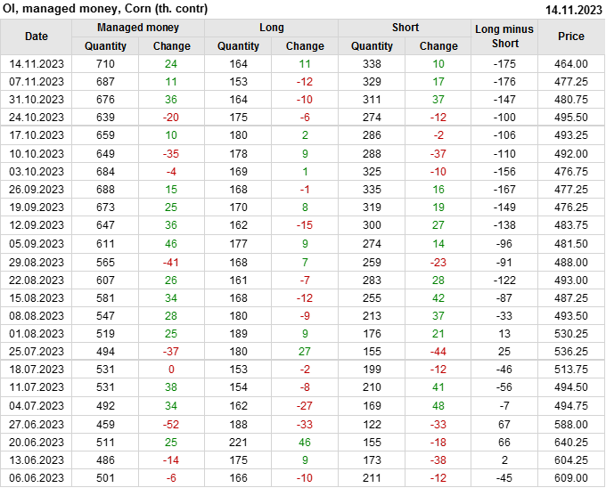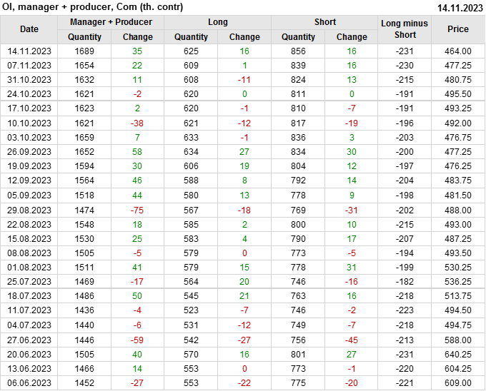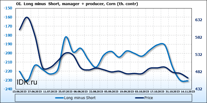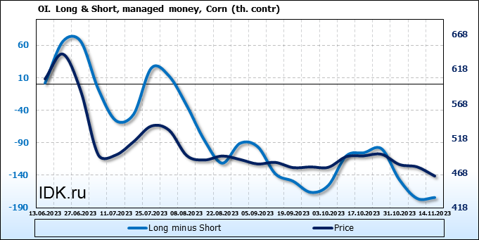 За прошлую неделю, 08.11.23 — 14.11.23, разница между длинными и короткими позициями управляющих сократилась на 1.4 тыс. контрактов. В тоже время, цена упала на 13.25 цента.