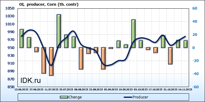 Открытый интерес производителей вырос на 11 тыс. контрактов. Объем контрактов, направленных на хеджирование, составляет 978 621 штуку. Деньги производителей в течение прошлой недели приходили на рынок поддерживая тенденцию.