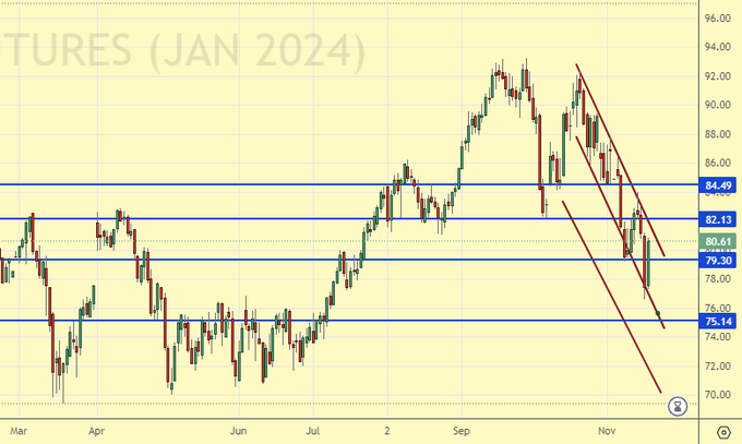 Growth scenario: we are considering November futures, expiration date is November 30. We were at 76.60, but didn’t go lower. Let’s not rush into shopping. Next week is likely to be slow ahead of the OPEC meeting.