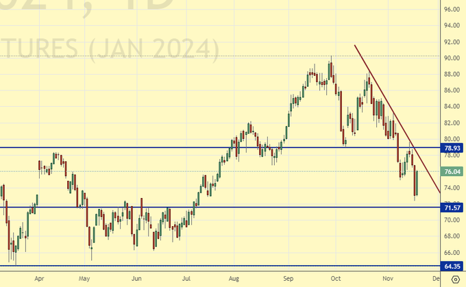 Together with the hoteliers, we are waiting for OPEC in Vienna on the 25th. Judging by the current situation on the market, we can assume that if no additional cuts are announced, then we will try the strength of the support at 75.00.