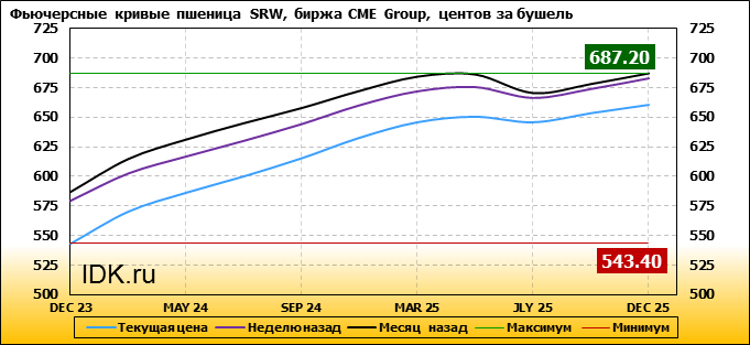 На 20.11.2023 стоимость пшеницы SRW на бирже CME Group по контракту DEC 23 составила 543.4 цента за бушель. За прошедшую неделю стоимость пшеницы SRW упала на 35.6 цента/бушель. Как мы видим на графике, фьючерсная кривая имеет периоды, когда более дальний фьючерс дешевле ближнего. Состояние бэквардации наблюдаем на следующих контрактах: JLY 25. Таким образом, трейдеры предполагают, что возможно превалирование предложения над спросом в указанные периоды.