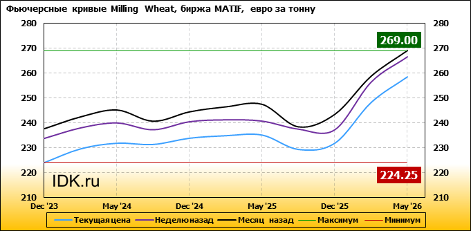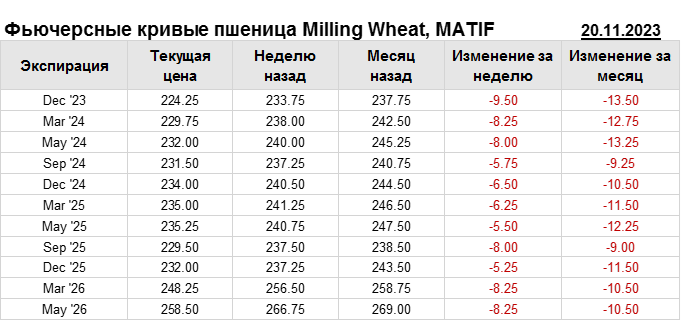 На 20.11.2023 стоимость пшеницы Milling Wheat на бирже MATIF по контракту Dec ’23 составила 224.25 евро за тонну. За прошедшую неделю стоимость пшеницы Milling Wheat упала на 9.5 евро/тонна. Как мы видим на графике, фьючерсная кривая имеет периоды, когда более дальний фьючерс дешевле ближнего. Состояние бэквардации наблюдаем на следующих контрактах: Sep ’24; Sep ’25. Таким образом, трейдеры предполагают, что возможно превалирование предложения над спросом в указанные периоды.