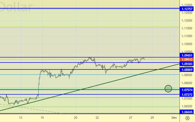 Вчерашний день ничем не закончился. Мысли те же: не исключено, что доллар сегодня продолжит падать и к этому надо быть готовым. Будем покупать в случае роста выше 1.0980.