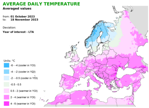 Долгосрочный прогноз погоды указывает на вероятные теплые условия, которые превысят 24-летнюю климатологическую медиану на величину до 2°C в декабре и до 1°C до февраля в большей части Европы. В декабре-феврале по всей Европе, кроме юга, прогнозируется количество осадков на 50 мм выше 24-летней климатологической медианы.
