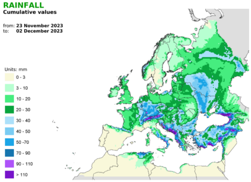 Аналогичным образом, обильные дожди могут повлиять на поздний сев в Ирландии и Великобритании. В целом, продолжающиеся дожди в Западной Европе, если они продолжатся, окажут негативное влияние на общую посевную площадь. Хотя посев останется возможным в ближайшие недели, прорастание и начальное развитие будут все больше зависеть от мягких условий в декабре. Некоторые фермеры могут решить перейти на яровую пшеницу в начале следующего года.