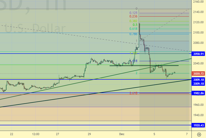 Уровень 2040 стал сопротивлением. Если рынок не сможет вернуться выше него, то нас ждет однонаправленный ход в район 1920. Сейчас или нужно подождать прохода ниже 2010 и продать, или подождать подъема к 2040 и тоже продать.