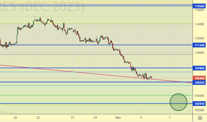 Скорее всего уровень 105000 сегодня падет, и мы пойдем ниже. Возможно, можно будет купить от 103000, но это будет зависеть от того, будут ли в принципе сигналы разворота. А то может нам пора уже пройти на 20000 (двадцать тысяч), где и поселимся на неопределенное время вместе с различными негосударственными пенсионными фондами, ПИФами, МИФами и тому подобными историями.