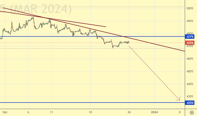 Продолжаем ждать от кукурузы сильного хода вниз, так как мы давно не были на этих уровнях (не проторговывали их), так как текущая тенденция направлена вниз, и так как объемы урожая второй год подряд остаются на рекордных отметках. Рост выше 480.0 вновь сделает ситуацию неопределенной.
