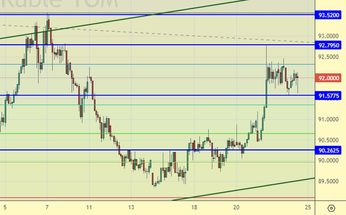 Если не будет роста выше 93.50, то у продавцов появятся шансы протолкнуть пару ниже 88.00. При этом, желательно чтобы цена на нефть марки Brent была выше 80.00 долларов за баррель. Любые намеки на снижение интенсивности СВО будут на моменте позитивны для рубля.