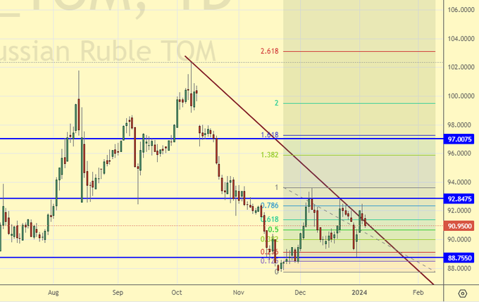 Среднесрочно, на три месяца вперед, есть понимание, что мы можем тяготеть к укреплению перед выборами, возможно даже будет ход к 80.00. Впрочем, рубль не сможет долго доминировать над долларом из-за высоких трат на оборону. Если же укрепления в январе и феврале не будет, то это может спровоцировать крайне агрессивные проходы от 90.00 в район 125.00 уже летом.