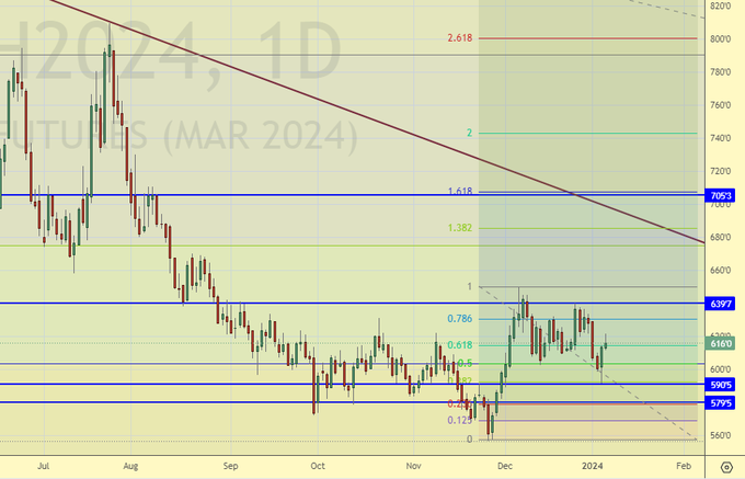 Сценарий падения: если кукуруза свалится, то она утащит пшеницу вниз. Однако, падение будет ограниченным. Вряд ли мы увидим цены ниже 580.0.